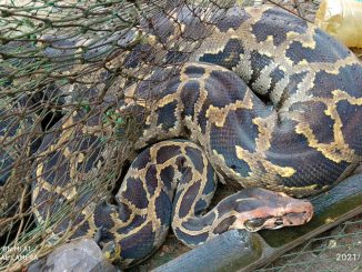 കളത്തികടവ് പാലത്തിനു സമീപം മീൻ കൂടിനുള്ളിൽ അകപ്പെട്ട നിലയിൽ പെരുമ്പാമ്പിനെ കണ്ടെത്തി.