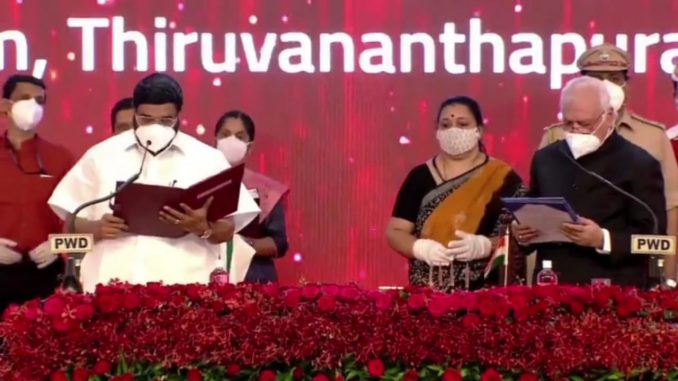 തിരുവനന്തപുരം സെൻട്രൽ സ്റ്റേഡിയത്തിൽ നടന്ന ചടങ്ങിൽ മുഖ്യമന്ത്രിയും നിയുക്ത മന്ത്രിമാരും ഗവർണർ ആരിഫ് മുഹമദ് ഖാൻ മുമ്പാകെ സത്യപ്രതിജ്ഞ ചെയ്ത് അധികാരമേറ്റു.